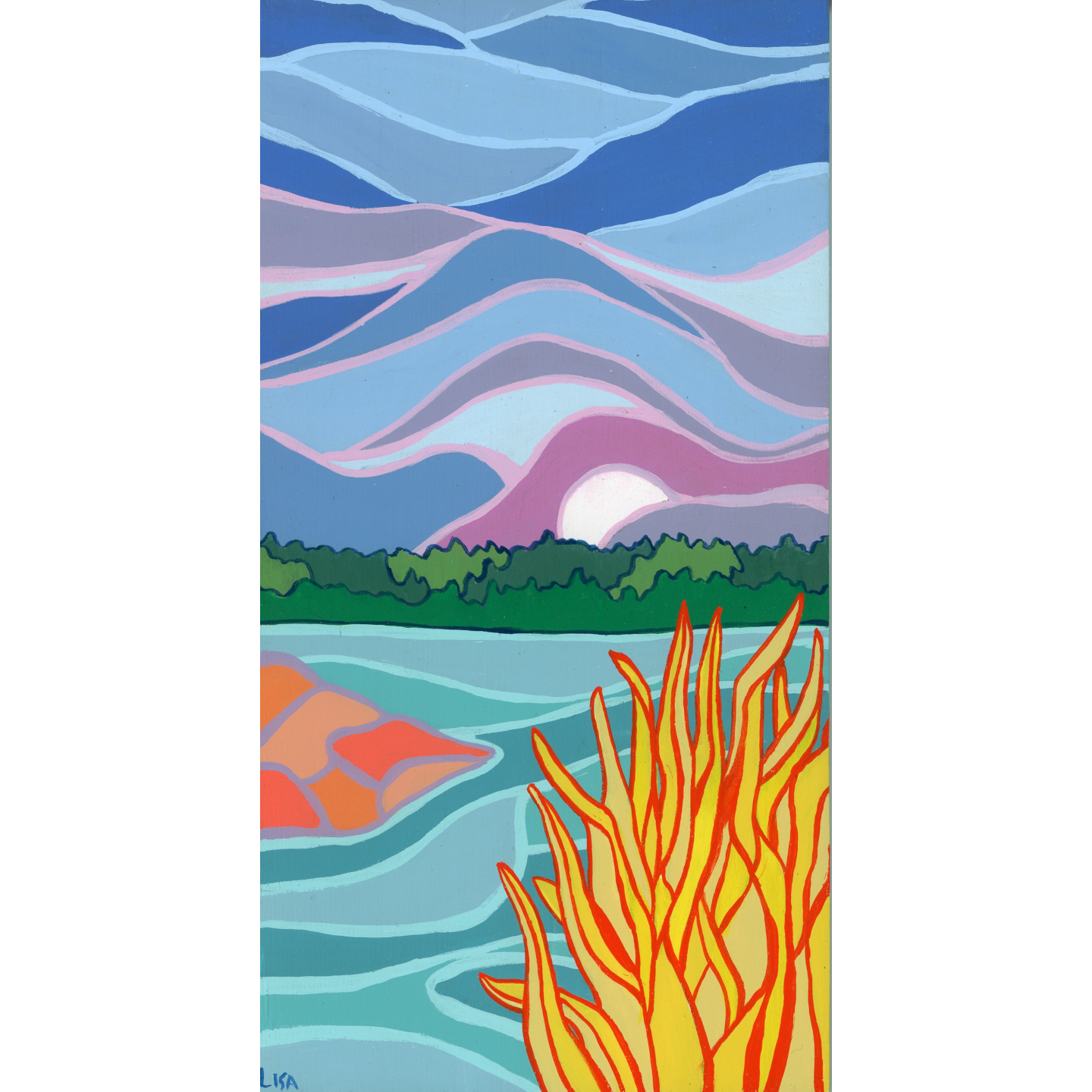 This colorful painting was inspired by my time on Whidbey Island in Washington State. I often spent mornings walking the short trail along Deer Lagoon, watching great blue herons and snacking on fresh blackberries plucked straight from the vine.