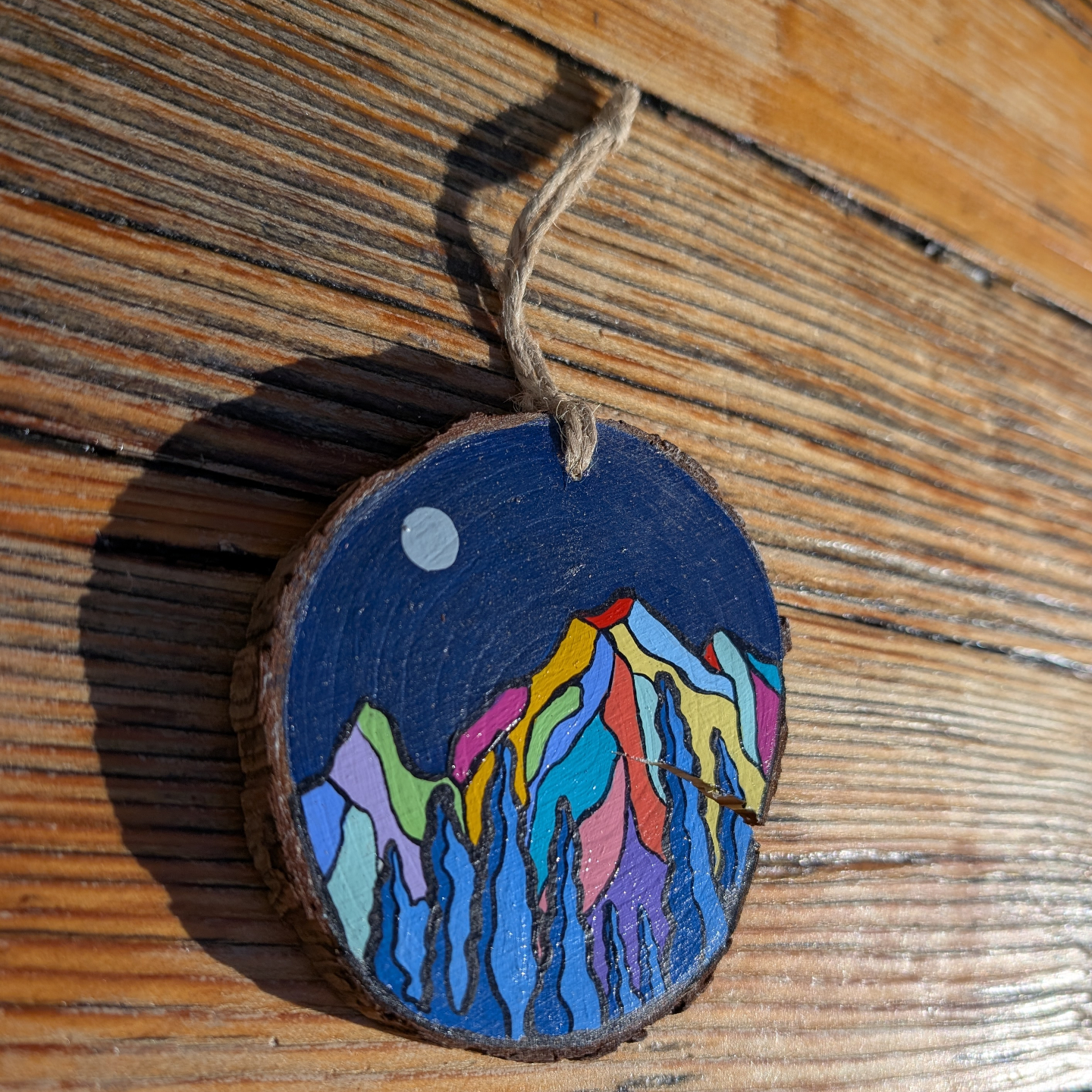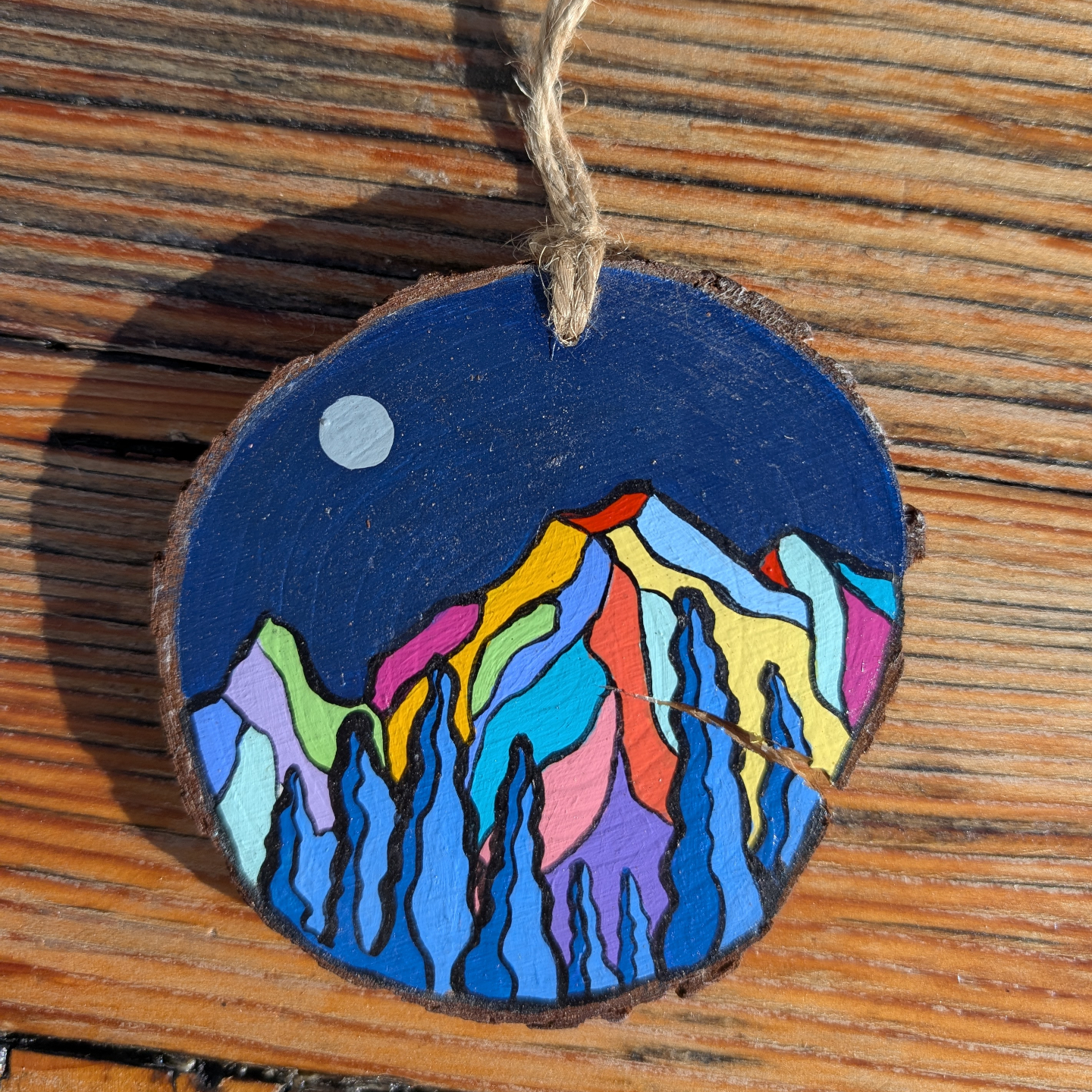 Slices are natural wood and vary in size, shape, texture, and color. Also, just as in nature, some of the wood has cracked and small bits of bark may come loose over time. This adds to the beautiful rustic individuality of each tiny painting.