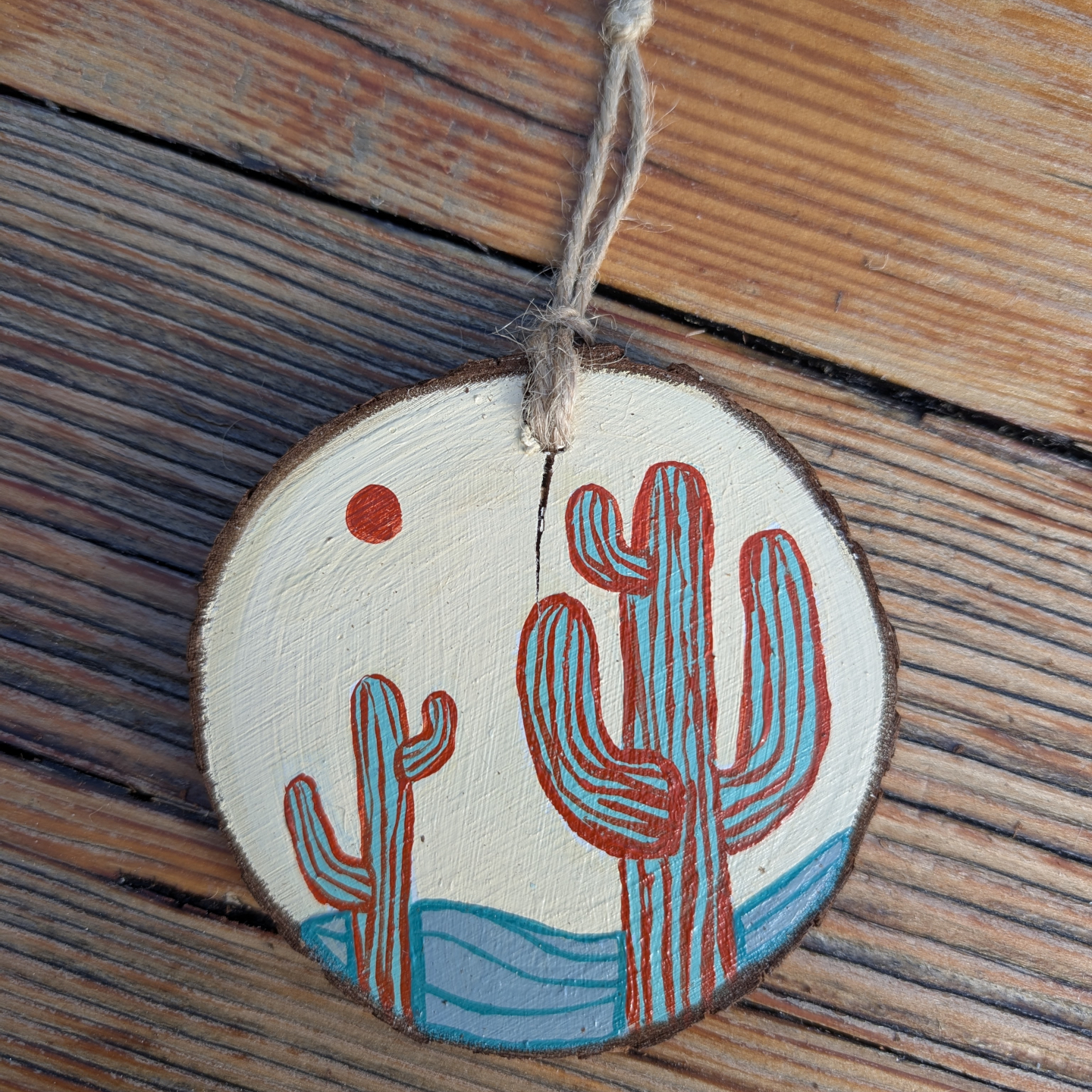 These beautiful ornaments are hand-painted on wood slices made from natural pine wood with bark.
