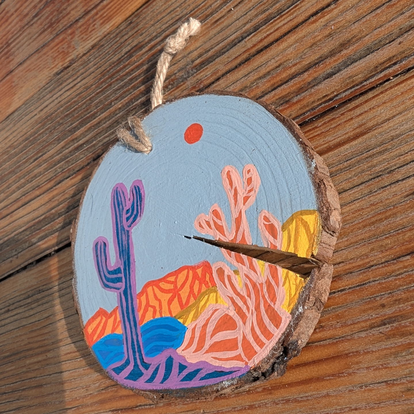 Slices are natural wood and vary in size, shape, texture, and color. Also, just as in nature, some of the wood has cracked and small bits of bark may come loose over time. This adds to the beautiful rustic individuality of each tiny painting.