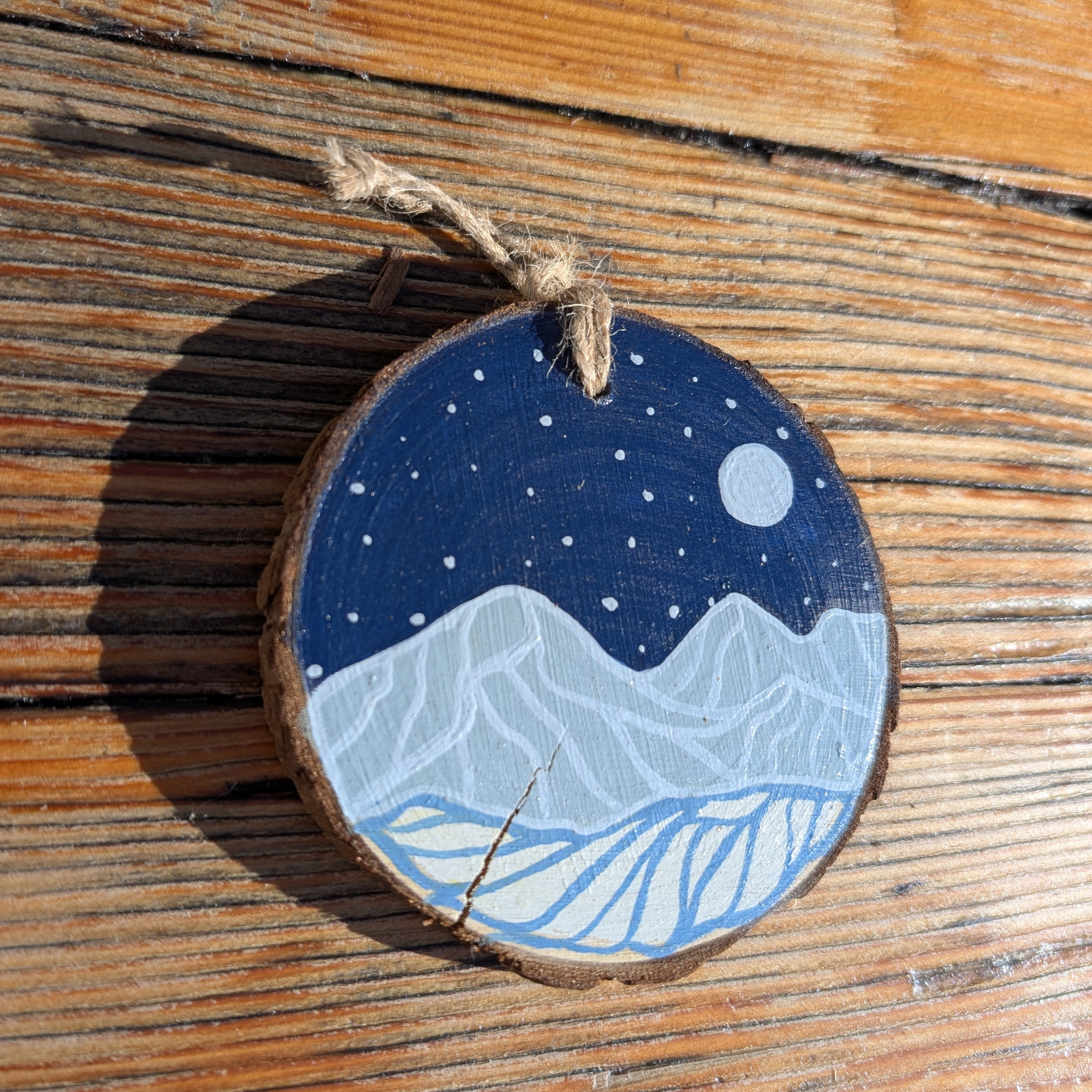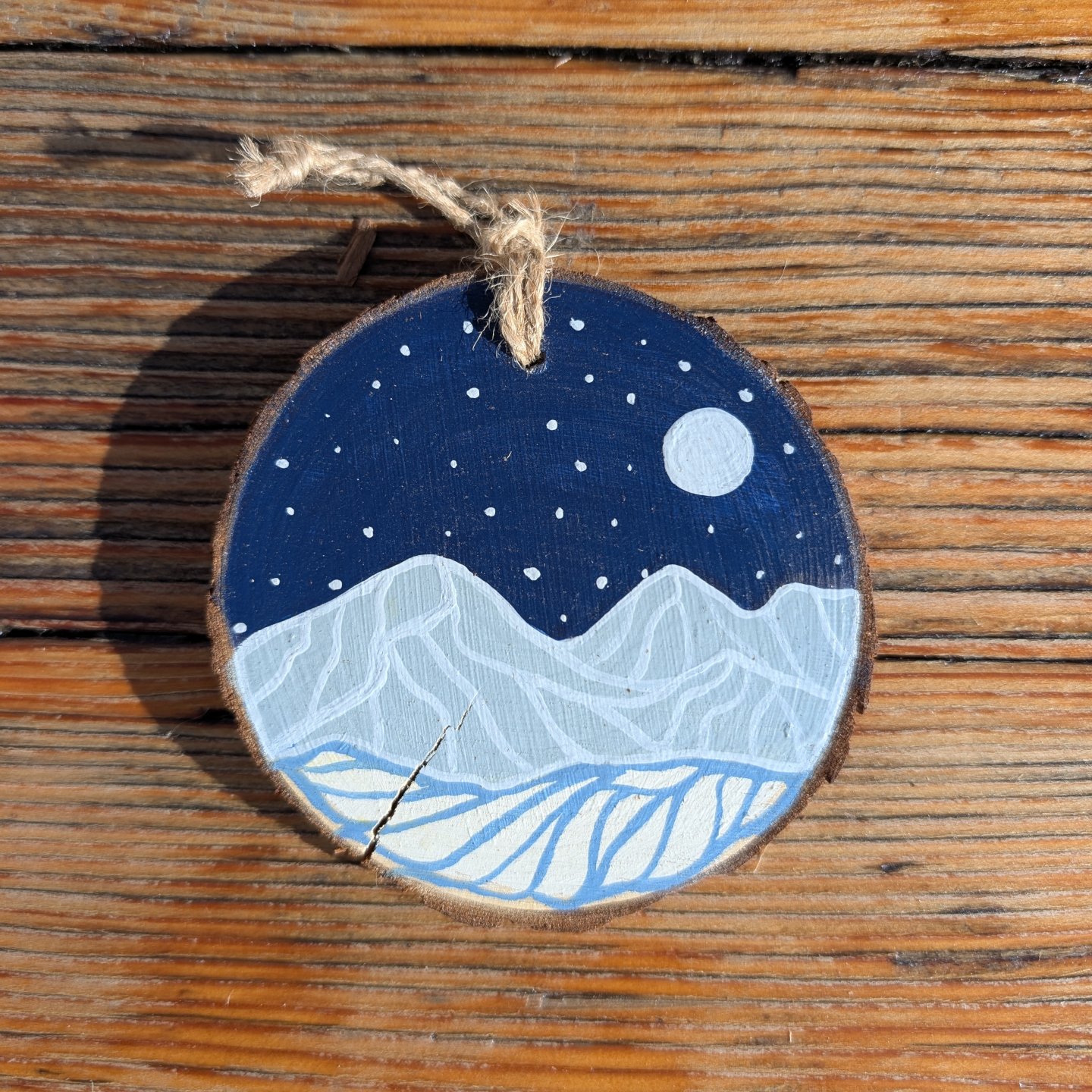 Slices are natural wood and vary in size, shape, texture, and color. Also, just as in nature, some of the wood has cracked and small bits of bark may come loose over time. This adds to the beautiful rustic individuality of each tiny painting.