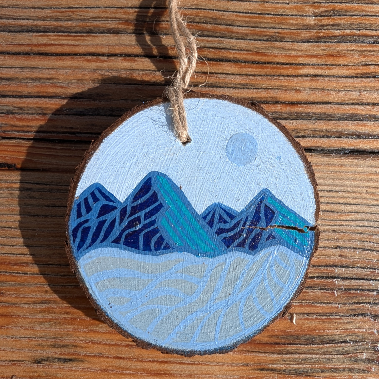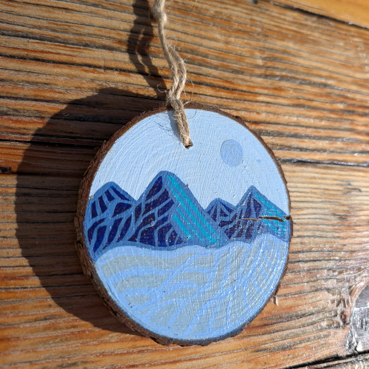 These beautiful ornaments are hand-painted on wood slices made from natural pine wood with bark.