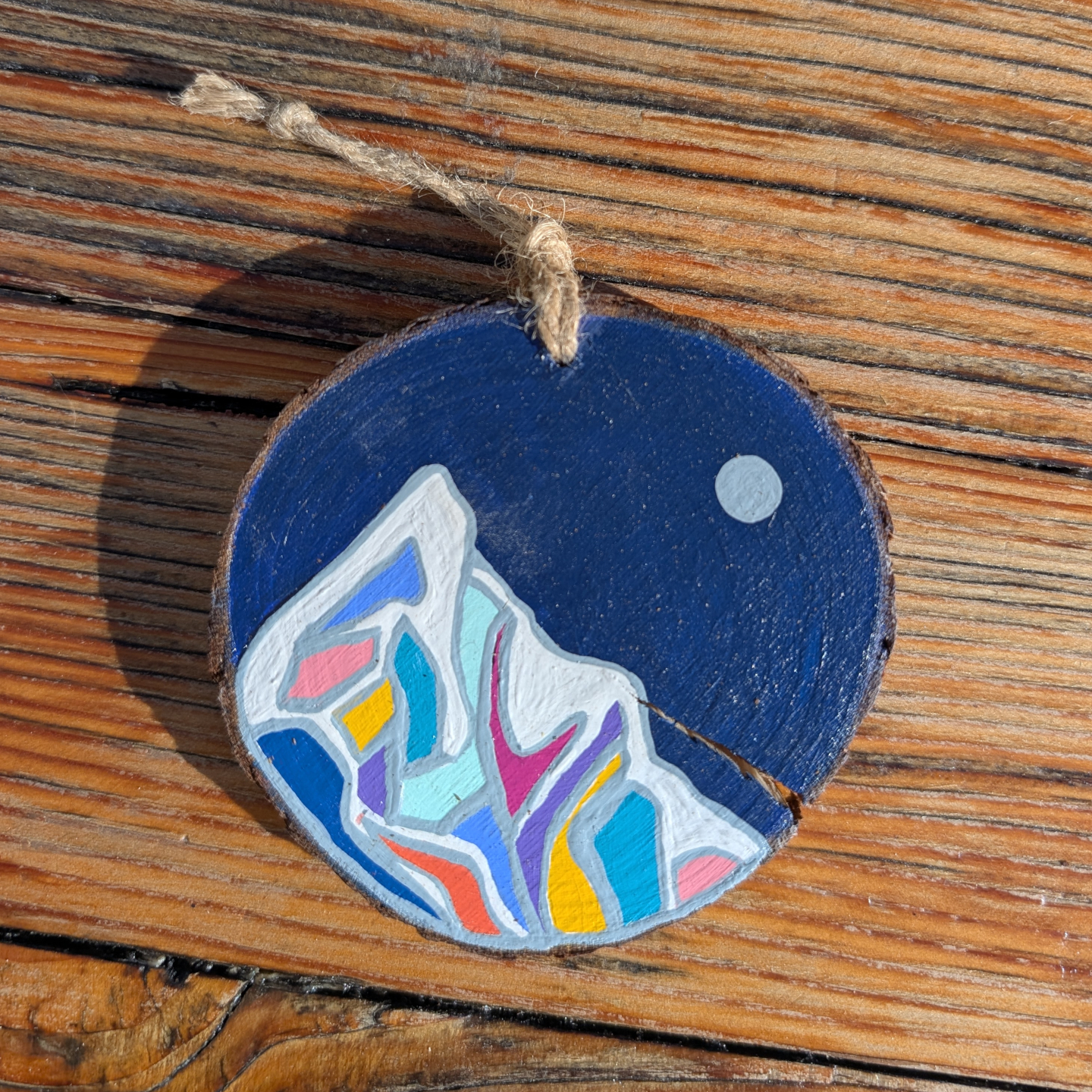 These beautiful ornaments are hand-painted on wood slices made from natural pine wood with bark.