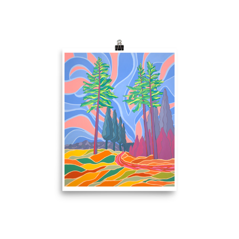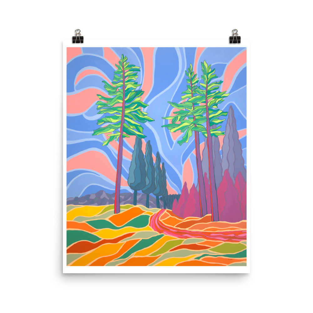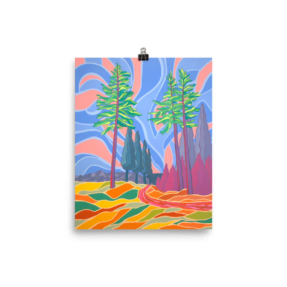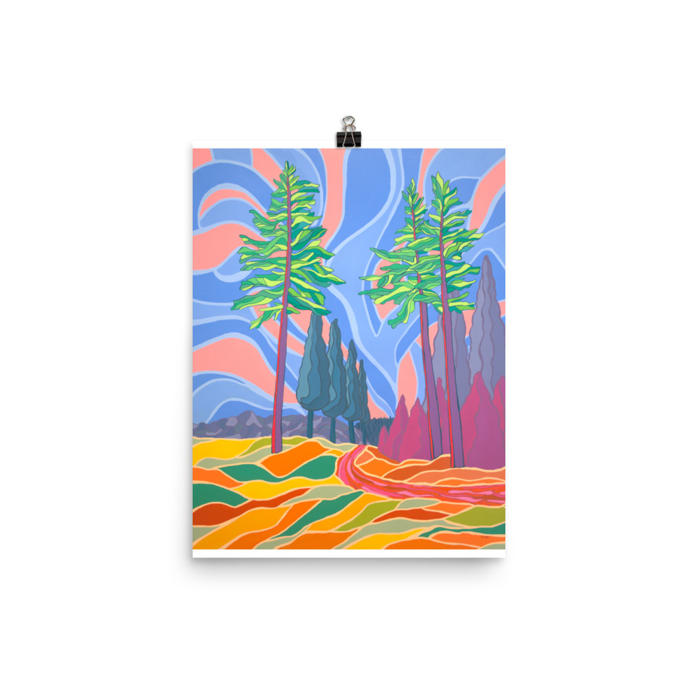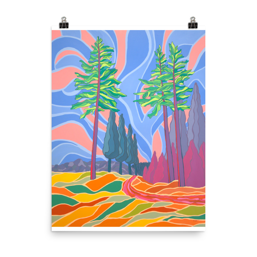 A campsite near Mount Hood, Oregon, inspired this painting. The brilliant pink sky during sunset illuminated the forest in a way that made the trees, rocks, and grasses appear jewel-toned.