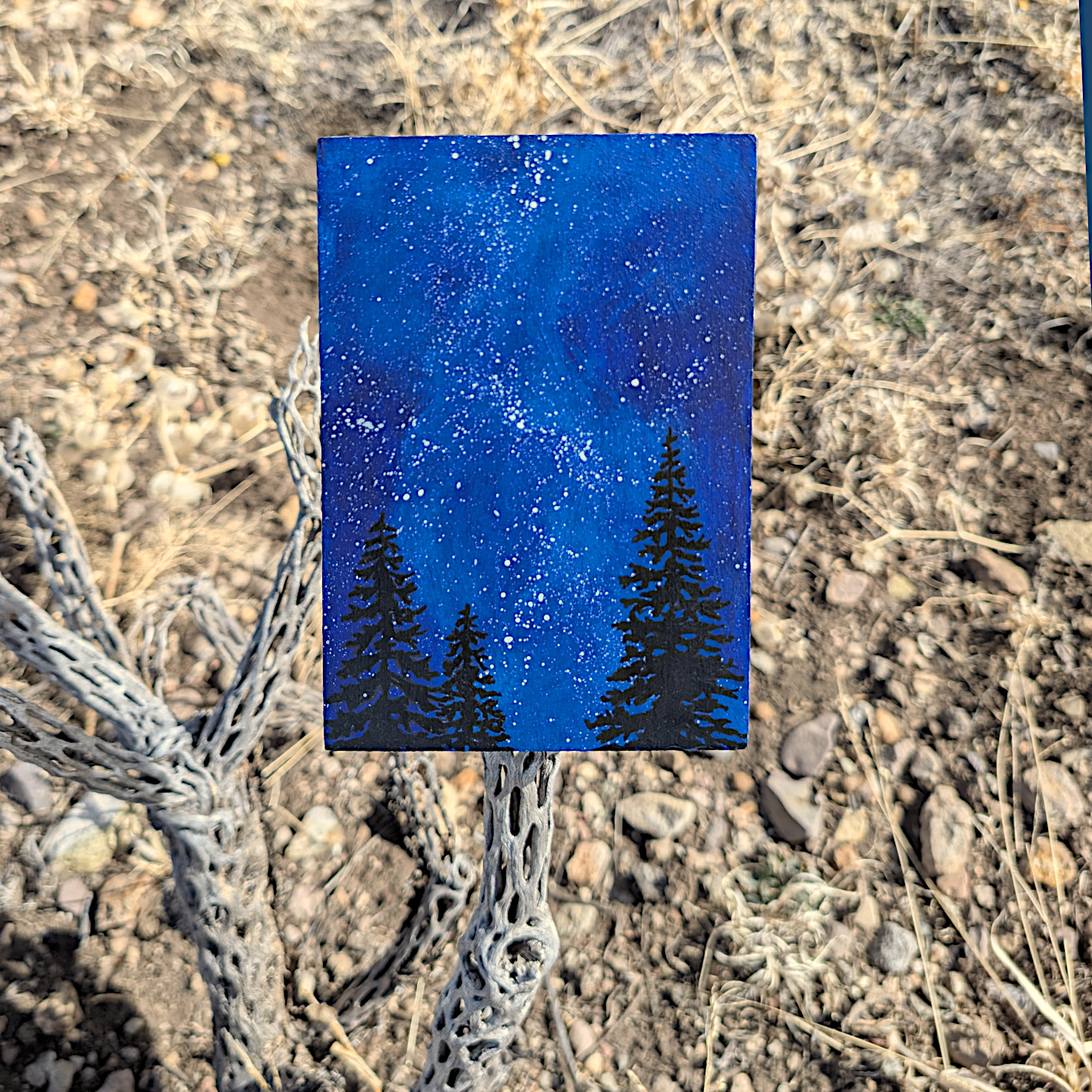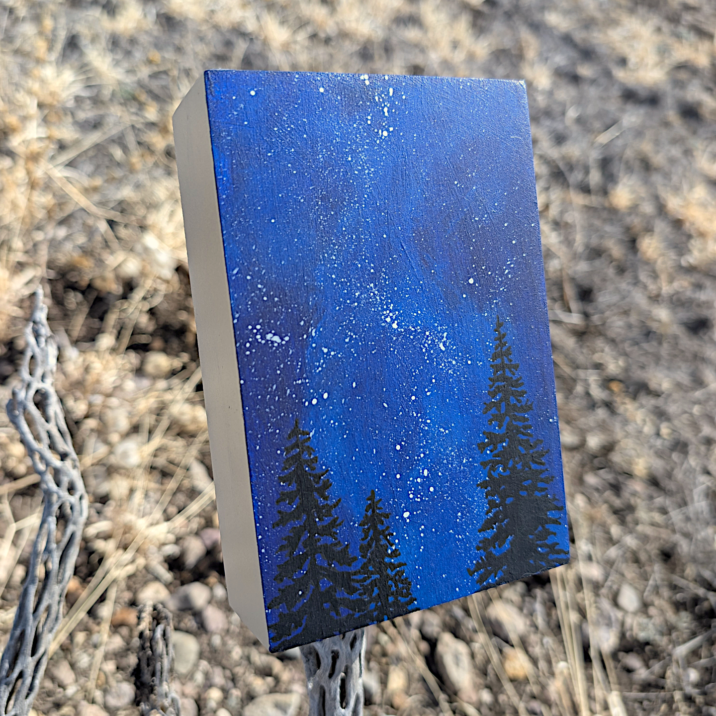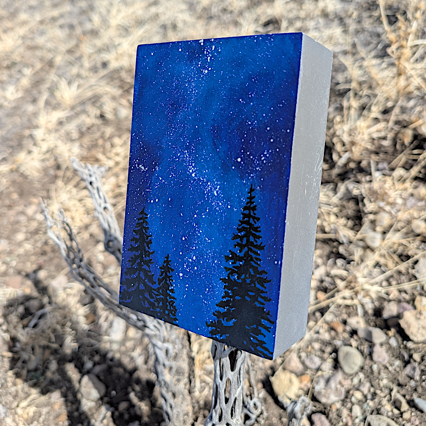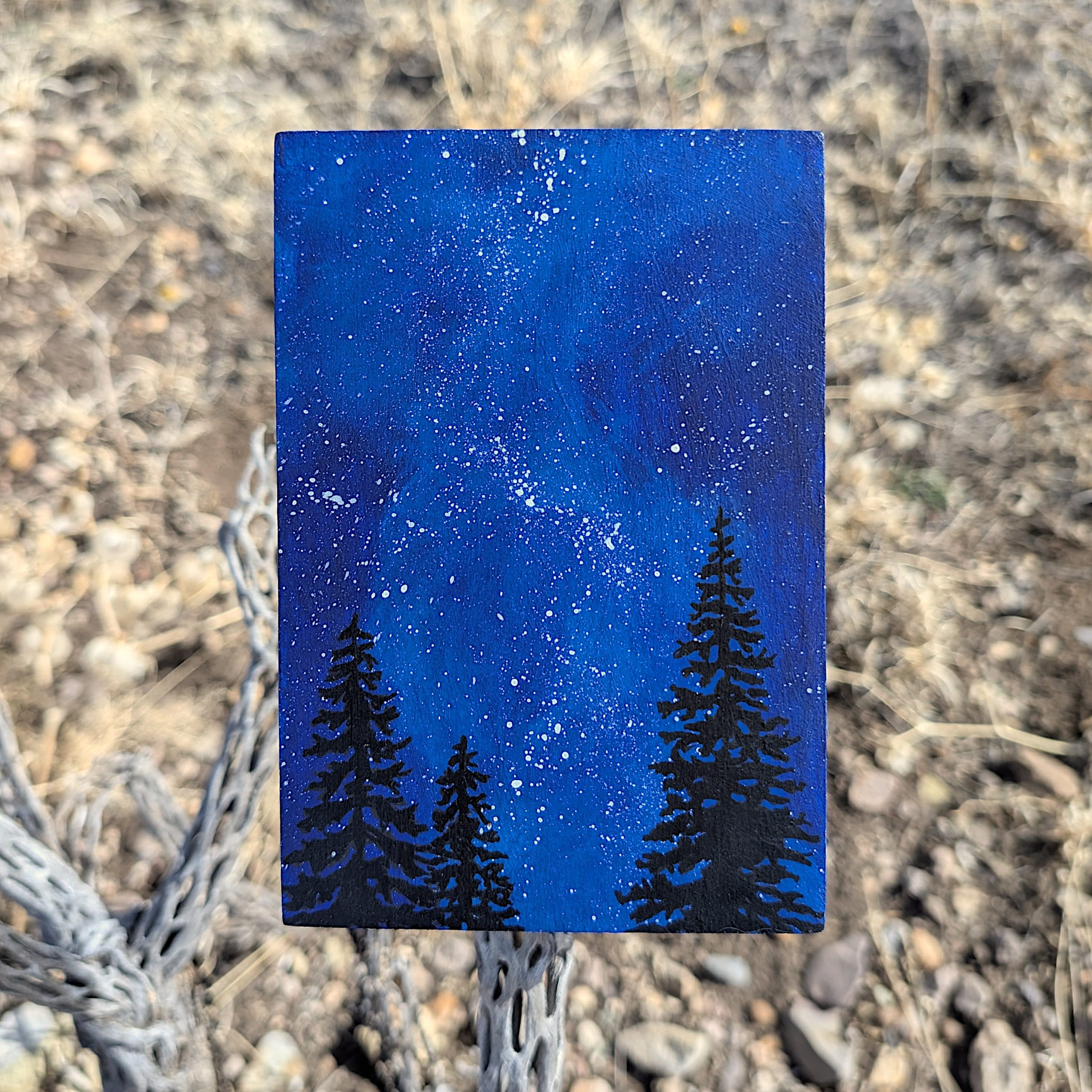 Bring the wonder and awe of the expansive night sky into your home with this original painting. Choose a star, make a wish, and let this serene scene add a bit of magic to your space. Lightweight, easy to hang or sit on a shelf.